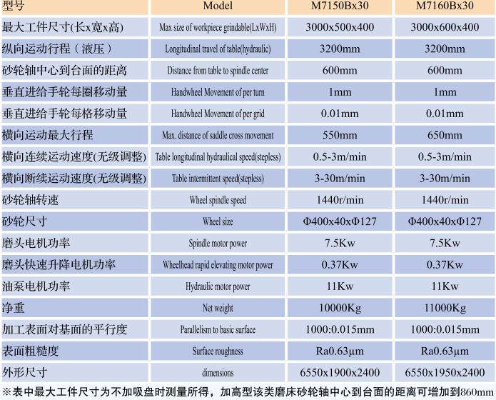 该机床为工作台纵向采用液压传动的高效磨削机床,磨头横向运动可以液动,也可以手动。磨头垂直升降、在原手动基础上增加了快速升降机构,提高了生产效率。使用于各种机械加工、汽车配件、工夹具、磁钢、模具等零件的加工行业。 技术规格