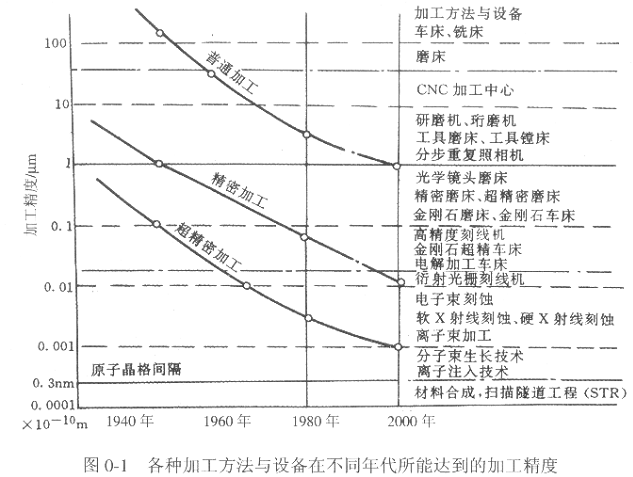 自机械制造业问世以来,广大科技工作者都把提高产品加工精度作为追求的目标并不断为之奋斗,取得突破。图0—1为各种加工方法与设备在不同年代所能达到的加工精度。