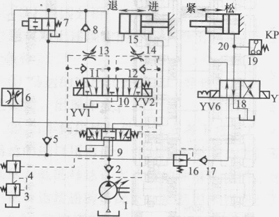 1-变量泵,2,5,8,11,12,17-单向阀;3-溢流阀;4-顺序阀;6-调速阀;7-行程阀;9~液控阀;10-三位五通电磁阀;13,14-节流阀;15,20-液压缸;16-减压阀;18-二位四通电磁阀;19-压力继电器