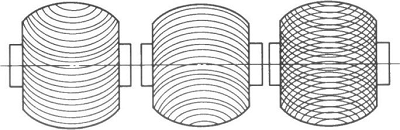 (6)检查磨削痕迹。如果工件球体表面呈凸状花纹时[见图5(a)],说明砂轮的下半周参加磨削,磨床砂轮的中心高于工件中心。反之,如果工件球体表面呈凹状花纹时[见图5(b)],说明砂轮的上半周参加磨削,砂轮的中心低于工件中心,应调整磨床内圆磨具的中心位置,使磨床砂轮轴线与工件中心等高,反映在球面上应呈交叉网状花纹[见图5(c)],其不等高度误差在0.003-0.004mm内。