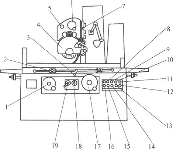 垂直手动进给 | 磨头的进给是通过摇动垂直进给手轮17来完成的。操纵时,把垂直进给轮17、向里推进,使操纵箱内齿轮啮合,摇动垂直进给手轮17,磨头垂直上下移动。手轮顺时针方向摇动动一圈,磨头就下降lmm,每格进给量为0.005mm | |
