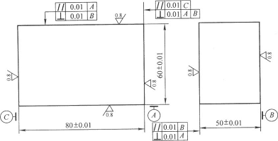 此六方体工件三对面的尺寸公差为0.01mm,相互之间的平行度公差为0.01mm,六面间的垂直度公差为0.01mm,六面的表面粗糙度值为m0.8pm。磨削六方体工件时,先磨削厚度最小的两平行面,然后磨削厚度较大的垂直面,最后磨削厚度最大的垂直面,磨削顺序不能颠倒。需要反复装夹与找正,进行粗、精磨削加工。
